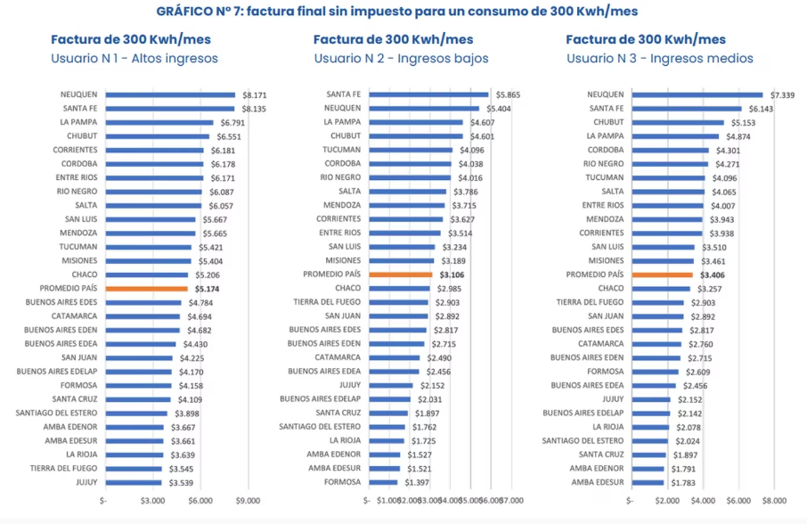 El documento muestra que los segmentos de altos ingresos de la provincia también pagan más que el promedio ($5174), ya que en el valor de la tarifa es de $6171. Aquí, los entrerrianos pagamos un 75 por ciento más que en Jujuy, por ejemplo, en donde la factura por 300 Kwh/mes es de $3539.