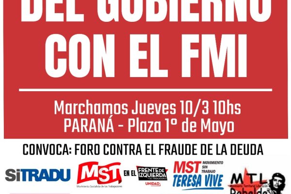 El Foro Contra el Fraude de la Deuda de Paraná convoca a movilizar contra el Fondo Monetario Internacional (FMI), ante su tratamiento en el Congreso · Será este jueves 10 de marzo a partir de las 10 en la Plaza 1° de Mayo, se informó a APFDigital · “Movilizar contra el acuerdo con el FMI es defender los derechos del pueblo trabajador”, expresó al respecto Nadia Burgos, dirigente del MST en el FITU