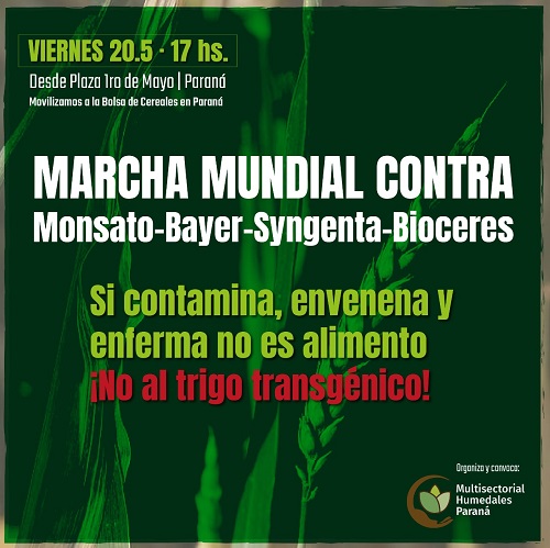 “Argentina es el primer país del mundo en aprobar un trigo transgénico, el HB4 que otorga exclusivos beneficios para quienes venden las semillas y los agrotóxicos que esas semillas resisten, ahora el nuevo “glufosinato de amonio” más peligroso que el glifosato, al que muchas plantas se hicieron resistentes”, señalan desde la Multisectorial por los Humedales de Paraná, que organiza y convoca a la marcha.