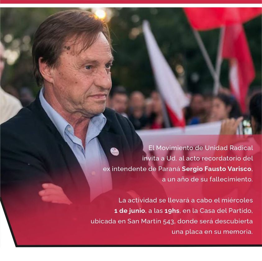 El Movimiento Unidad Radical (MUR) le hará un homenaje al histórico dirigente de Paraná, Sergio Varisco, a un año de su fallecimiento • Tendrá este miércoles 1º de junio en la sede provincial del Comité Provincial de la UCR: será a las 19 y se descubrirá una placa en su memoria