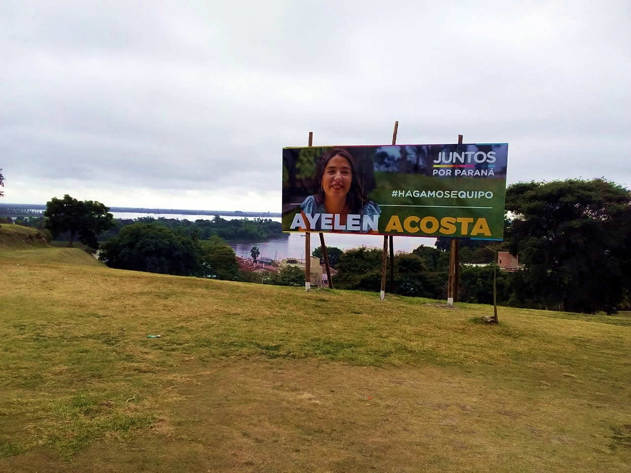De enormes dimensiones, el rostro sonriente de la diputada provincial Ayelén Acosta, con una leyenda con su nombre y espacio político, se interpone entre la vista de los paseantes del Patito Sirirí y ese paisaje protegido en que el río se hace ancho y acaricia la costa curvada de Puerto Sánchez y el Thompson.