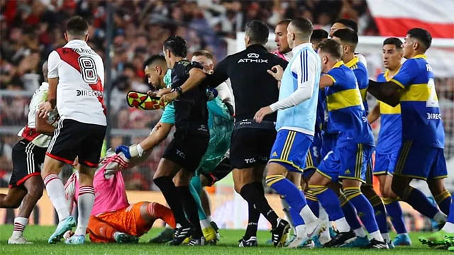 Con el ingreso a la cancha de los cuerpos técnicos, auxiliares y hasta de los futbolistas lesionados, el árbitro Darío Herrera siguió de cerca las acciones e intentó controlar la situación, que se extendió durante varios minutos, mientras que definió las expulsiones de Miguel Merentiel, Nicolás Valentini y Ezequiel Fernández en el “Xeneize”, además del entrenador Jorge Almirón, y de Palavecino, Ezequiel Centurión y Elías Góméz en River.