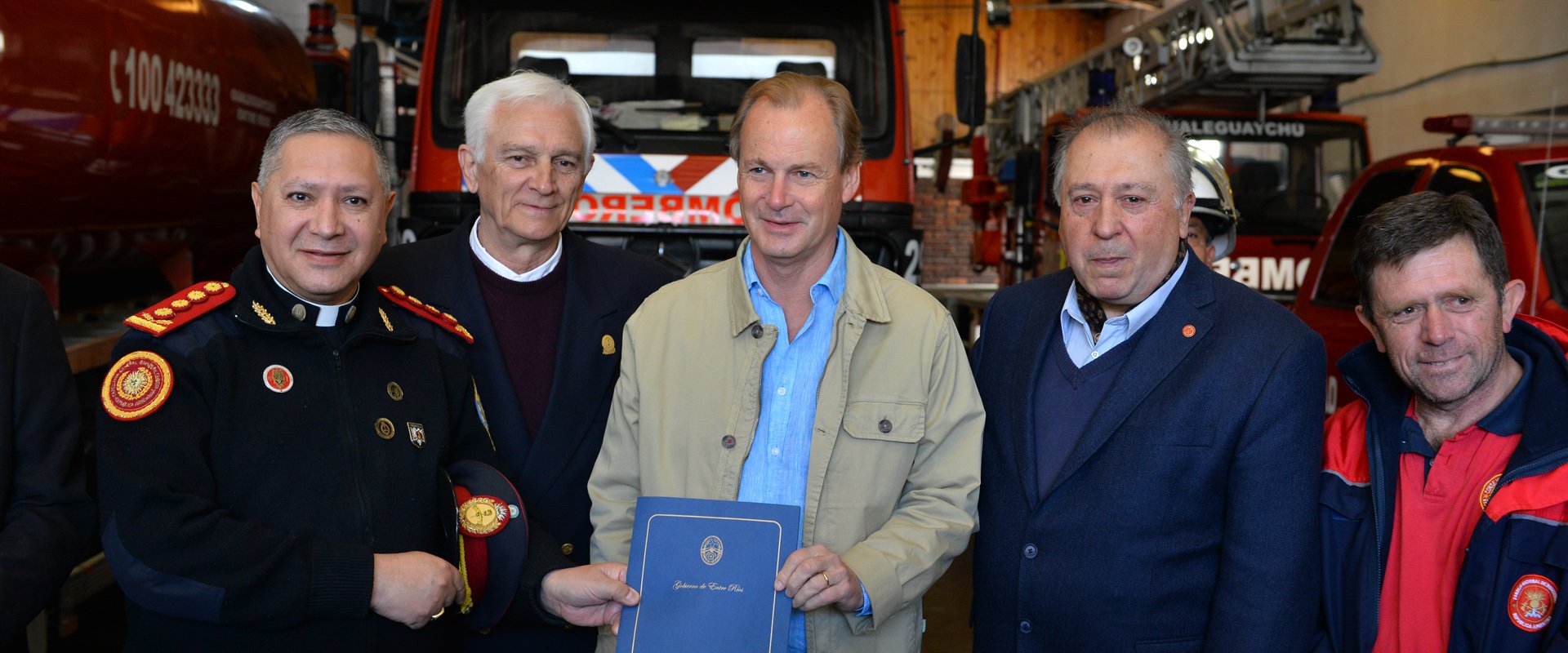 El mandatario, estuvo este viernes en Gualeguaychú donde fue recibido por el intendente, Martín Piaggio, y el secretario de Desarrollo Social, Martín Roberto Piaggio. Visitó el cuartel de Bomberos Voluntarios, y entregó a las autoridades de la Federación Entrerriana el decreto de promulgación de la Ley Nº 11.116, que entre otros beneficios otorga un servicio de salud y un haber jubilatorio a los bomberos voluntarios de la provincia.